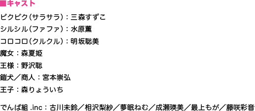• ■キャスト ピクピク(サラサラ):三森すずこ シルシル(ファファ):水原薫 コロコロ(クルクル):明坂聡美 魔女:森夏姫 王様:野沢聡 鎧犬/商人:宮本崇弘 王子:森りょういち   でんぱ組.inc:古川未鈴/相沢梨紗/夢眠ねむ/成瀬瑛美/最上もが/藤咲彩音