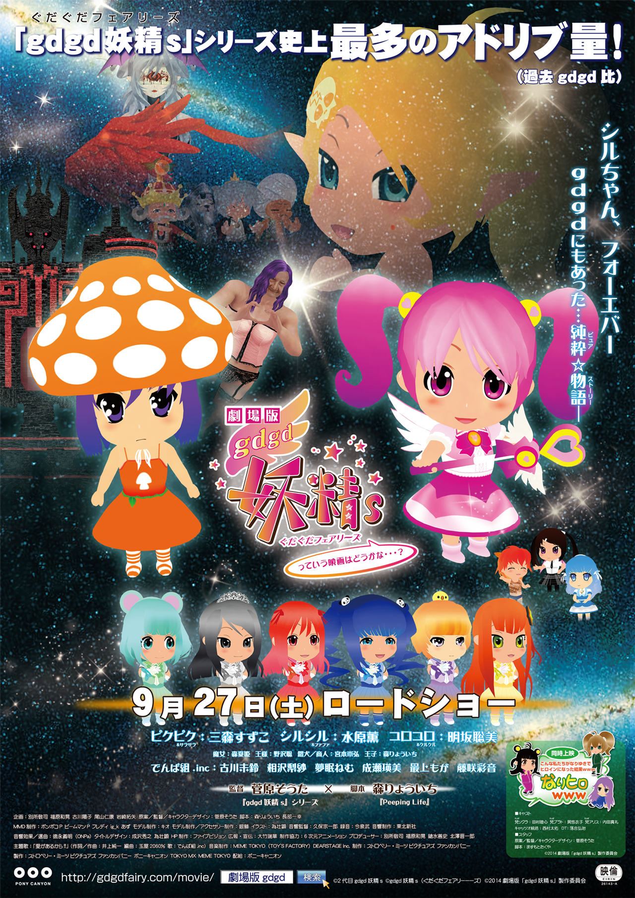9月25日(木)開場:20:50〜、開演21:00〜 三森すずこ、水原薫、明坂聡美の妖声優!?出演によるニコニコ生放送を行います!ニコニコの「劇場版gdgd妖精sサポーターch」会員しか見られない限定タイムもあり!どうぞお楽しみに!